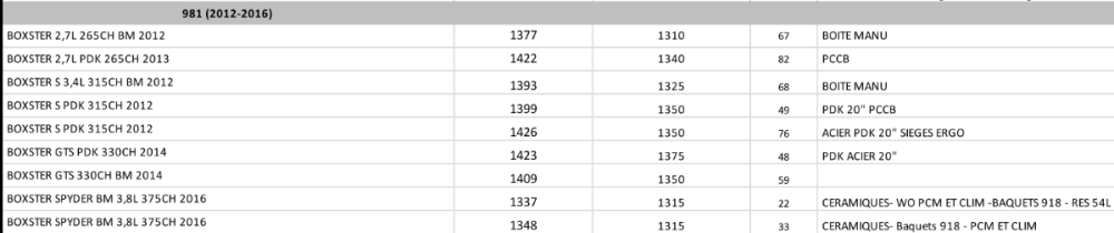 MSportCars Posté(e) le 27 février 2022 Auteur Posté(e) le 27 février 2022 UPDATE MARS 2022 La dernière LOTUS thermique EVORA GT 421CH.L'une des premières Hypercar GUMPERT APPOLO S et ses 750CH!La nouvelle GT3 pack Touring pour la première fois en PDK. AUDI Q7 II 3,0L V6 TFSi 333CH BA 2016RSQ3 5CYL 2,5 400CH 2022 (52kg d'écart entre une version full options et une light céramiques) BMW i4 EDRIVE40 340CH 2022 CHEVROLET CAMARO SS 1LE PACKAGE V8 461CH BM 2016 (1700kg de muscle car) FORDFIESTA ST edition 1,5L 3PORTES 200CH 2022 (suspensions réglables, pas de semi-slicks)MUSTANG MACH-E STANDARD RANGE RWD 269CH 2022 GUMPERT APPOLO S 750CH 2016 LEXUS IS 500 F-SPORT V8 5,0L 479CH BA 2022 (super son) LOTUS EVORA GT 421CH 2021 (+1400kg) MERCEDES EQB 350 4MATIC 299CH 2022 PORSCHE 550 SPYDER 1,5L 110CH 1955992 CARRERA GTS SS PACK LIGHT 480CH PDK 2021 (63kg de plus que la GTS pack light et céramiques)MACAN 2,0T FACELIFT 265CH 2022MACAN S FACELIFT V6 380CH 2022992 GT3 TOURING 4,0L 510CH PDK 2022 (c'est fait, les 1500kg) TESLA MODEL Y LONG RANGE 389CH 2022 (presque 2T) TOYOTA COROLLA GTI-16 130CH 1990 (-1100kg, une autre époque) VOLVO XC40 RECHARGE T5 R-DESIGN 231CH 2022C40 RECHARGE TWIN AWD 408CH 2022 VW GOLF R VARIANT 320CH DSG 2022POLO GTI 2,0L 207CH 5 PORTES DSG 2022 (elle a pris 30kg) WESTFIELD SEIGHT V8 4,0L 275CH BM 1993 ( V8de 275ch pour moins de 700kg!!) https://www.weightcars-fr.com