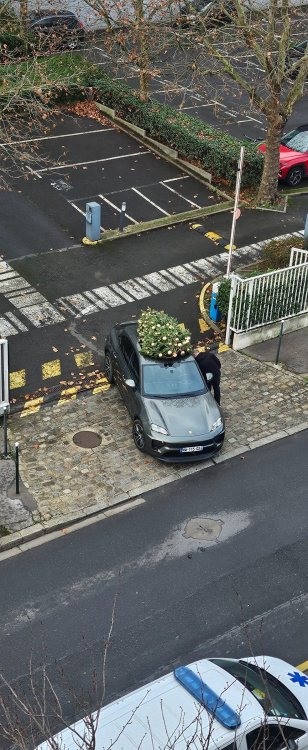 Oui ce n est pas la meme voiture sur les photos vu qu il y a bien 2 voitures différentes ^^ Un macan electrique et une gt3 que Porsche France ont preparé pour faire des ronds dans Paris pour Noël. Et là il fait jour mais ils ont mis des guirlandes dessus pour suivre la tendance de tout ceux qui décorent le voiture en ce moment avec des guirlandes de partout. J espere qu ils ont mis un bon PPF sur le toit quand même