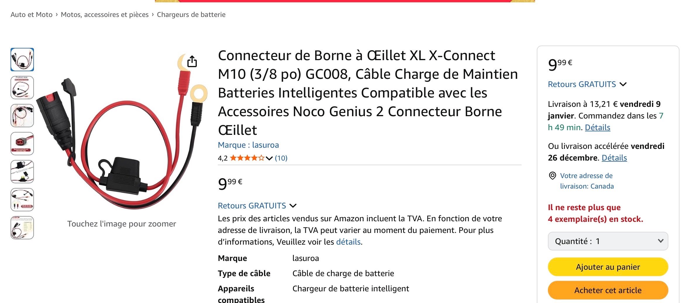 Oui sans doute un bug du BMS… Le truc c’est que le courant de la prise au pied du passager se coupe au bout d’un quart d’heure, donc oui il faut le brancher avant. Sur les forums US ils recommandent de le brancher avec le contact mis et de couper le contact ensuite, si tu veux vraiment faire comme ça Mais le mieux est de le brancher en direct sur le + de la batterie et le - sur un écrou de masse près de la batterie comme un du haut de l’amortisseur (pas sur le - de la batterie par contre) Cest pour ça qu’avec le NOCO j’ai commandé en plus ce câble